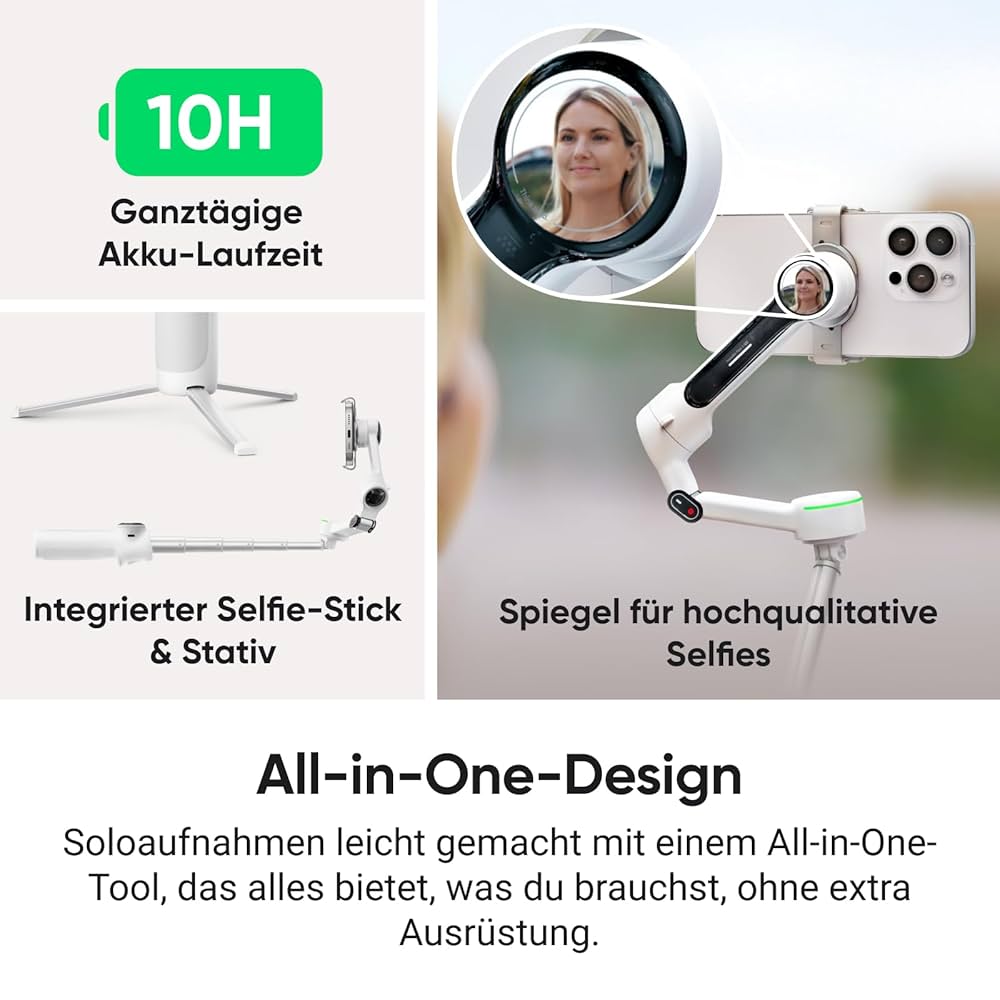 - Tous les outils essentiels réunis dans un seul stabilisateur IA pour téléphone. Trépied intégré pour les prises de vue iPhone/Android, perche à selfie, miroir à selfie, prompteur, batterie externe et 10 heures d'autonomie. Avec le Flow 2 Pro, vous êtes équipé pour une journée complète de tournage, sans équipement supplémentaire.