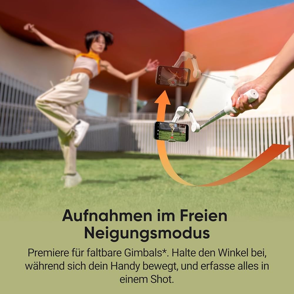 - Prises de vue créatives avec le mode inclinaison libre : une nouvelle référence pour les stabilisateurs pliables. Bénéficiez d'une plus grande amplitude de mouvement et conservez le même angle lorsque votre téléphone se déplace de haut en bas. Capturez tout en une seule prise de vue continue.