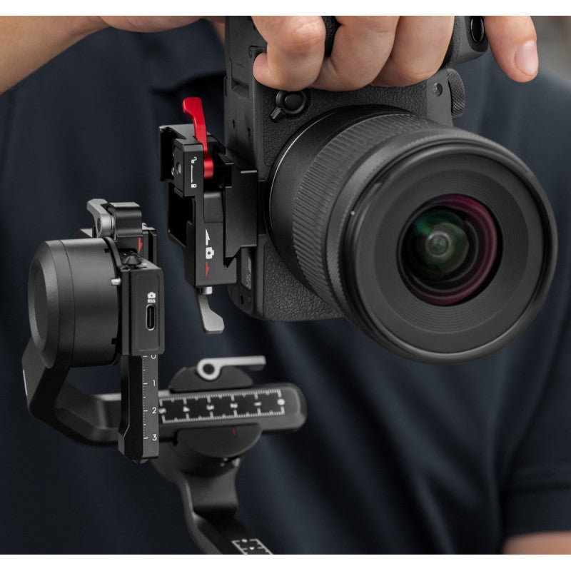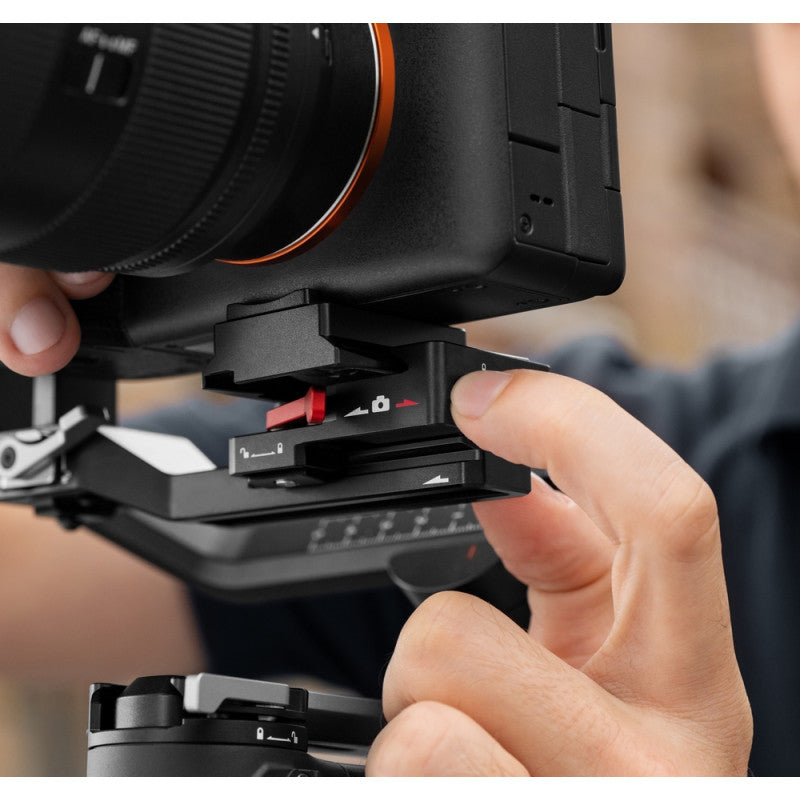 Grâce à son support à démontage rapide, vous fixerez rapidement et démonterez vite votre caméra du stabilisateur, toujours avec précision car des repères sont incrustés sur ce dernier et le corps du gimbal. En retirant le support à démontage rapide intégré, et en le fixant directement sur le bras vertical du DJI RS 3 Mini, il est possible de passer en mode vertical.